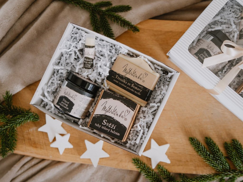 Všechno tohle zabaleno v elegantní papírové krabičce s průhledem, připravené rovnou k darování.